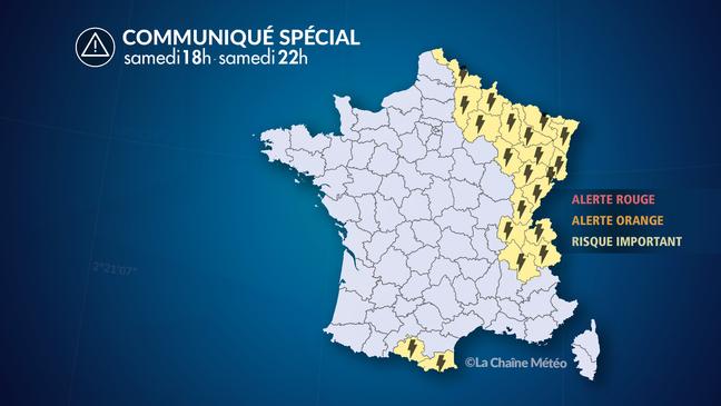 Cette forte instabilité orageuse se maintient jusqu'à dimanche 22 h sur l'est des Pyrénées, l'Alsace, la Lorraine ainsi que le Jura et le nord des Alpes.