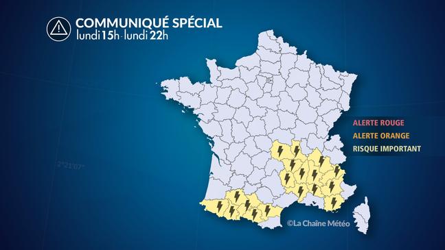 Ce lundi soir, l'instabilité orageuse persiste jusqu'à 22 h, avec de forts orages encore possibles sur les départements placés en alerte, avant le retour au calme dans la nuit de ce lundi à mardi pour le Languedoc et Rhône-Alpes. En revanche, sur le sud de l'Aquitaine, le risque de forts orages persiste plus longtemps, jusqu'en milieu de nuit.