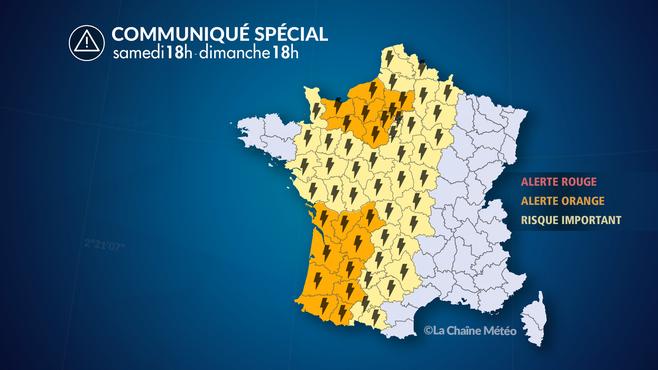 Après une après-midi très lourde, une première vague orageuse remonte ce soir des Pyrénées et de l'Aquitaine au Limousin. Elle provoque des orages très électriques, un risque élevé de chutes de grêle ainsi que des rafales pouvant atteindre près de 100 km/h en rafales.