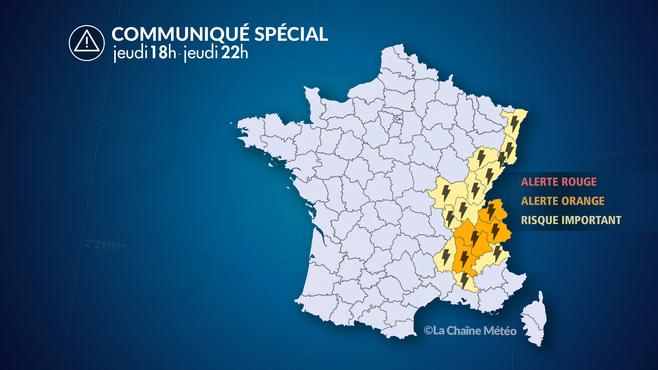 Les orages se décalent majoritairement sur le centre-est, entre les Cévennes, Rhône-Alpes-Auvergne, Bourgogne, Franche-Comté et le Grand Est. Les départements situés à l'est du Rhône et de la Saône sont les plus exposés aux forts orages avec des chutes de grêle et de brusques rafales. La période de 15 h à 20 h est la plus virulente. Ils s'annoncent forts avec un risque de grêle entre le Rhône, l'Isère et la Haute-Savoie.
