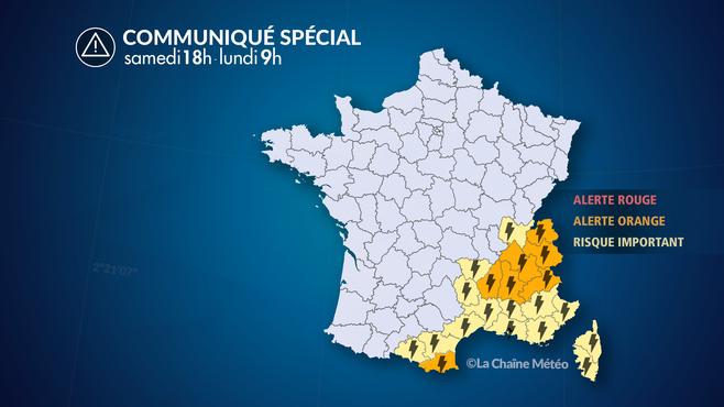 Cette situation provoque une dégradation pluvio-orageuse marquée des Pyrénées aux Alpes à la Méditerranée jusqu'à lundi. Au cours des 24 prochaines heures, plusieurs vagues orageuses remontent du sud-ouest vers le Centre-Est. Ces vagues pluvio-orageuses peuvent se montrer virulentes. Lundi, la Corse sera également balayée par une ligne de puissants orages. Lundi, les pluies resteront marquées en Rhône-Alpes, et il neigera fortement au-dessus de 2500 mètres. Parallèlement, avec la plongée d'air froid en Méditerranée, une dépression va se creuser sur le golfe de Gênes. Mistral et tramontane souffleront jusqu'à 90 à 100 km/h entre dimanche soir et lundi soir. En Corse, des rafales tempétueuses sont envisagées, vers 130 km/h sur le relief corse et les caps et côtes exposés.