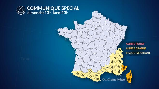 Ce soir, les orages les plus forts sont attendus du sud des Alpes à la côte d'Azur. En Corse, les orages éclatent, accompagnés d'un renforcement du vent à près de 100 km/h. Sur le nord des Alpes et les Pyrénées, les pluies continues d'intensité modérée se poursuivent toujours.