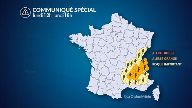 Ce lundi, les pluies orageuses les plus intenses se concentrent sur un axe allant de l'Ardèche et de la Drôme aux Alpes du Nord en passant par l'Isère. Les cumuls de pluie les plus importants se produisent en matinée et jusqu'en début d'après-midi avec des intensités horaires qui peuvent atteindre 20 à 30 mm sous les orages les plus actifs. Dans l'après-midi, les orages deviennent moins violents et moins organisés, mais les cumuls de pluie peuvent encore être importants par endroits. Les conditions météo s'améliorent nettement en soirée et le communiqué spécial peut être levé.