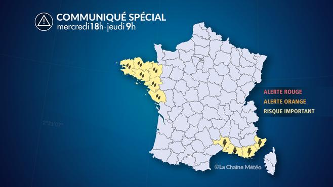 Deux dégradations se mettent en place ce mercredi, une par la Bretagne et une autre en Méditerranée. Une dépression circule au nord des îles britanniques et son front froid associé traverse les régions du nord-ouest. La progression de ce front est très lente, en raison du flux de sud marqué à l'avant et par conséquent les cumuls sur 12 à 15 heures deviennent significatifs. On attend en moyenne sur la Bretagne, la Loire-Atlantique et la Vendée, entre 30 et 50 mm, voire un peu plus, l'équivalent de 2 à 3 semaines de pluie.