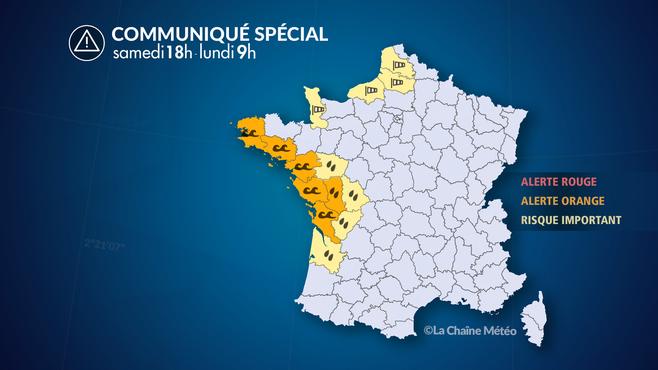 Dans la nuit de samedi à dimanche, le vent souffle jusqu'à 100 km/h en rafales sur les côtes. La pleine mer intervenant sur les départements atlantiques entre 4 et 6 h du matin, c'est pendant cette période que le risque de submersion littorale sera le plus important, entre la Charente-Maritime et le sud du Finistère.