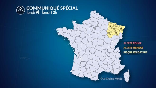 Entre 10 et 12h, avec la hausse de la température et l'évacuation de la perturbation vers l'Allemagne, le temps va s'améliorer et ce communiqué spécial sera levé à 12 h