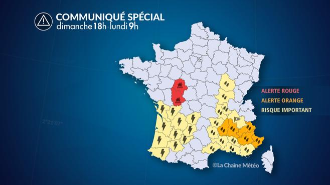 Dans le sud-ouest, de forts, mais brefs orages remontent des Pyrénées et de l'Aquitaine vers l'ouest du Massif central et le Limousin ce soir, jusqu'en milieu de nuit de dimanche à lundi. Ils provoquent une forte activité électrique ainsi qu'un risque de grêle et de brutales rafales à près de 100 km/h.