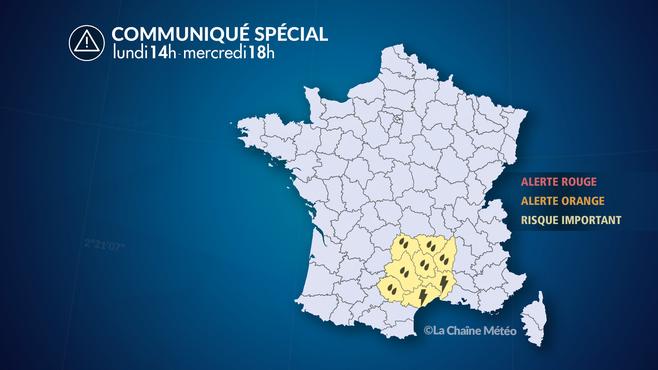 Il s'agira de la journée la plus délicate de cette semaine. En effet, une nouvelle salve pluvio-orageuse remontera de Méditerranée se généralisant à tout le sud du pays et le Massif-Central. L'épisode cévenol reprendra de la vigueur, sous forme orageuse. Sur les départements et régions limitrophes (PACA, vallée du Rhône, Préalpes, sud du Jura et Bourgogne), il pleuvra beaucoup, souvent sous forme d'orages. Ces précipitations tombant sur des sols saturés d'eau pourraient entraîner de nouveaux risques de crues et d'inondations.