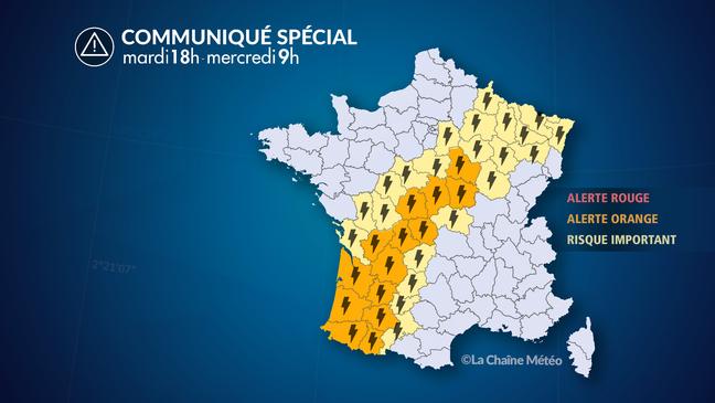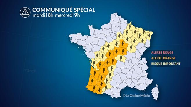 Une nouvelle salve orageuse se met en place ce mardi soir. Après une journée chaude et lourde avec fréquemment plus de 30°C dans le sud-ouest, des orages se développent dans le sud de la Nouvelle-Aquitaine. Ces orages remontent en direction du Limousin en soirée et sont localement violents avec de très fortes averses (intensité horaire de 20 à 40 mm/h sous les plus fortes cellules). À noter, également, le risque de grêle important sous ces orages et de fortes rafales (> 100 km/h). Ces orages remonteront ensuite en direction du Centre-Val de Loire et de la Bourgogne puis s'évacueront en matinée de mercredi par le nord-est. D'autres départements seront susceptibles de passer en niveau d'alerte orange au cours de la journée.