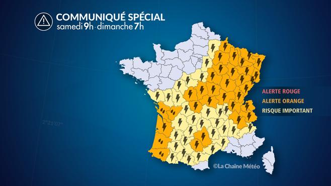 L'évolution du samedi après-midi sera très rapide. Dans une ambiance lourde, les orages vont se multiplier sur les deux tiers du pays, de l'Occitanie à l'Auvergne, région Centre, Cévennes, puis sur la Franche-Comté et les Alpes. Le vent sera soutenu, notamment en montagne (Massif Central) puis, en fin d'après-midi, dans la vallée du Rhône (80 km/h) et le Val de Saône. Le Tarn et l'Aveyron semblent soumis aux orages les plus forts dans cette zone.