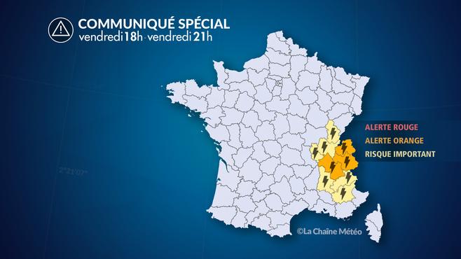 À l'est du Rhône, les orages sont violents et s'accrochent aux Alpes toute la journée avec de fortes rafales ainsi qu'un risque de grêle et d'une forte activité électrique. Les cumuls pluviométriques abondants sur les Alpes peuvent entraîner des ruissellements et crues des torrents en montagne. Cela survient sur des sols fragilisés par les derniers épisodes. En cette période de départs en vacances, il conviendra d'être prudent sur les routes de montagne.