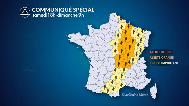Samedi en fin d'après-midi, les premiers orages forts éclatent sur le Massif Central. Ils remontent rapidement en soirée vers l'ouest de la Bourgogne, l'est du Centre-Val de Loire puis la Seine-et-Marne. Ils atteignent l'est des Hauts-de-France, la Champagne et la Lorraine en début de nuit.