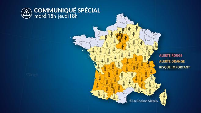 Sur les départements placés en alerte orange, les nuits sont tropicales avec des températures qui ne descendent pas en dessous de 20°C et des maximales atteignant ou dépassant 35°C l'après-midi pendant au moins 3 jours consécutifs avec des pointes entre 38 et 40°C