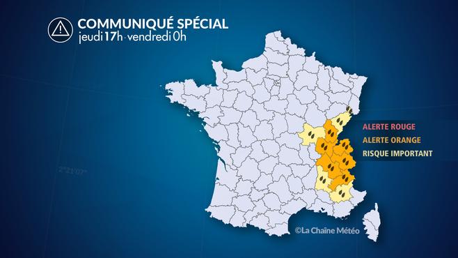 Ce sera l'amélioration rapide après minuit sous l'effet de l'arrivée de l'air froid. L'isotherme 0°C chutera drastiquement en montagne, avec un bref coup de neige en fin d'épisode sur les Alpes du Nord. Le risque orageux s'évacuera également en Italie sous l'effet de la levée du vent d'ouest en Méditerranée.
