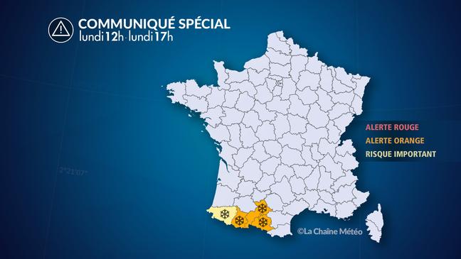D'abondantes chutes de neige se poursuivent dans les Pyrénées jusqu'à ce lundi soir avec 1,50 m de neige au total attendu au-dessus de 2000 m d'altitude. Il s'agit d'un véritable blizzard avec la formation de congères en altitude. Sur la simple journée de lundi, 25 à 40 cm de neige supplémentaires sont attendus sur les Pyrénées centrales, au-dessus de 1200 mètres et 10 à 20 cm ailleurs en moyenne. On surveille ce début de semaine un fort risque d'avalanche sur ce massif. Les chutes de neige faiblissent en revanche ce lundi sur le massif central d'où le retrait de l'alerte pour ces départements.