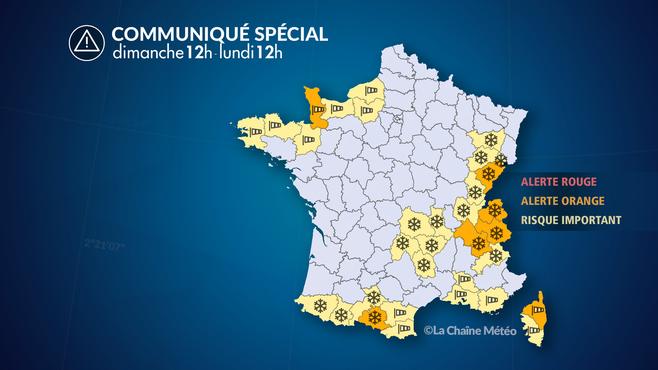 Cet après-midi, prudence, car le vent souffle violemment à plus de 100 km/h en bord de Manche avec des pointes vers 120/130 km/h sur les côtes de la Bretagne et le Cotentin au passage des grains orageux. Parallèlement, le vent se renforce et atteint 110 à 120 km/h sur le sud du Massif central, les Alpes et les Pyrénées où la limite pluie / neige s'abaisse vers 1000 mètres. La tramontane atteint 120 km/h entre Perpignan et Narbonne. Des conditions de blizzard s'installent dans le Jura, en Savoie et en Haute-Savoie jusqu'en Isère. Il neige également sur le Massif central à partir de 1000 mètres.