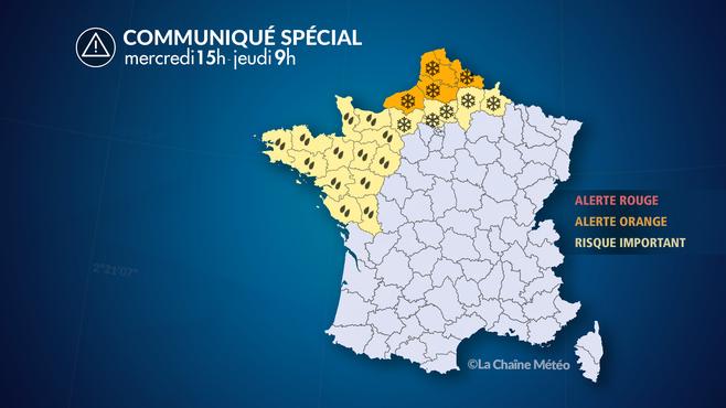 Cette situation nécessite un communiqué spécial avec des accumulations possibles de 4 à 8 cm, localement 10 cm sur les collines normandes, les plateaux picards jusque vers l'Artois, d'ici au début de matinée de jeudi. Un risque de verglas non négligeable est également présent en tout début de matinée de ce jeudi.