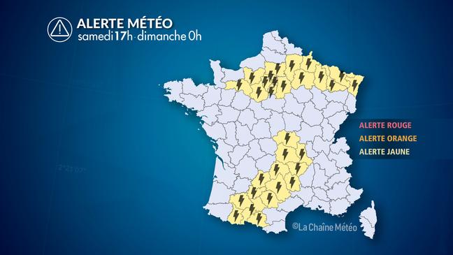 - Ce samedi soir, les orages éclatent au nord de la Loire ainsi qu'en Midi-Pyrénées jusqu'en Auvergne. L'activité orageuse est dispersée, mais ponctuellement soutenue au nord de la Loire, et cessera rapidement en soirée avec l'arrivée de l'air frais.