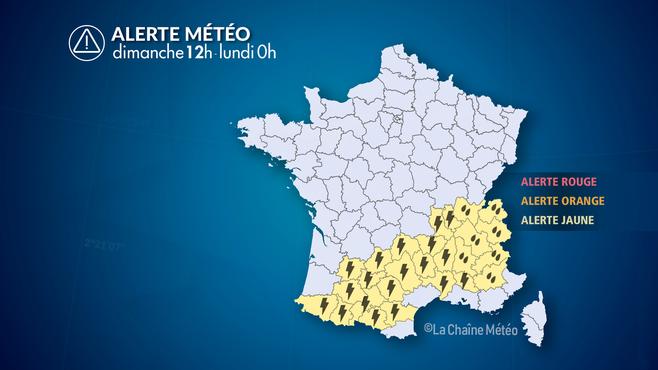 Ce dimanche à 15 h, la situation se dégrade très rapidement avec la multiplication et le renforcement des orages des Pyrénées au Languedoc au Massif central à Rhône-Alpes. Les orages les plus forts sont observés sur le piémont pyrénéen avec de la grêle, mais également du Languedoc et des Cévennes au Puy-de-Dôme ainsi que dans le val de Saône, entre Mâcon et Dijon. Ces orages sont ponctuels, mais ils peuvent des précipitations intenses, comme cela s'est produit entre 13 et 15h à Lavaur (81) où il est tombé 41 mm de pluie en 2 heures.