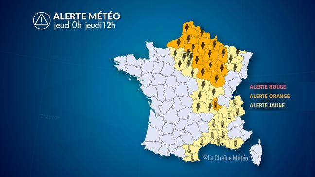 Dans la nuit de mercredi à jeudi, les orages remonteront vers les Hauts-de-France, la Champagne-Ardennes et la Lorraine en donnant de fortes précipitations, localement de la grêle et de puissantes rafales de vent. Les orages s'évacueront en fin de nuit et l'alerte orage pourra être levé jeudi matin.