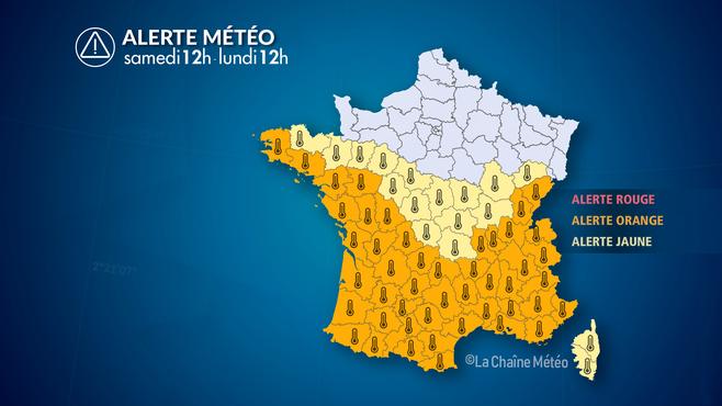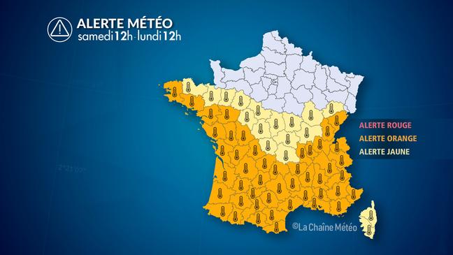 La canicule marque un rebond pour ce week-end dans l'ouest et le sud du pays. Les températures les plus élevées sont situées entre l'Aquitaine et l'Occitanie avec des pointes à 42°C samedi. Des Pays de la Loire au sud de la Bretagne, la température atteint ponctuellement 35°C