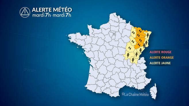 Une vague orageuse touche les régions situées au nord-est, du Jura au Luxembourg, en particulier de la Haute-Saône à la Moselle en passant par les Vosges. Ces orages sont assez forts dans la nuit, avec des cumuls de pluie abondants durant plusieurs heures.
