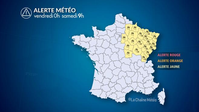Les chutes de neige, faibles mais continues, concernent le Grand Est, le nord de la Bourgogne et la Franche-Comté dès la matinée. Le verglas est bien présent de l'est de la Picardie à la Seine-et-Marne. L’après-midi et en soirée, ces précipitations s’étendent au nord de l’Auvergne jusqu'au val de Saône. La neige tient généralement au-dessus de 300 mètres.
