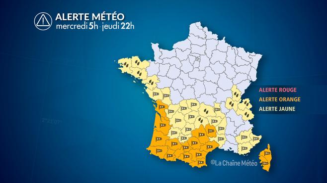 Ce mercredi, un premier fort coup de vent concerne la Corse avec des rafales tempétueuses de 120 à 140 km/h sur le cap corse et des déferlements à 90-100 km/h sur la région bastiaise. Le vent souffle aussi violemment sur l'extrême sud de l'île et la côte orientale du côté de Porto-Vecchio avec des rafales de 100 à 120 km/h. Les pluies sont encore soutenues en matinée du Jura aux Alpes avant une relative accalmie dans l'après-midi. La limite pluie-neige fluctue entre 1500 et 1700 m. Dans l'ouest et le sud-ouest, les précipitations restent fréquentes et parfois fortes, notamment en fin de journée entre la Bretagne et les Pays de la Loire avec des intensités pouvant atteindre temporairement 10 mm/heure avec un risque de nouvelles inondations. Dans ce contexte météo très pluvieux avec des sols saturés, Vigicrues place de nombreux cours d'eau de l'ouest et du sud-ouest en vigilance orange crues.