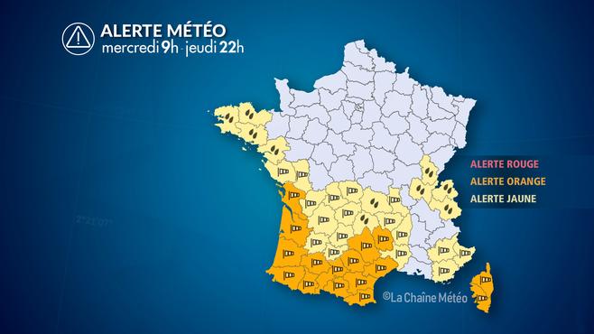 Côté précipitations, les pluies restent soutenues ce mercredi du Jura aux Alpes avec une limite pluie-neige qui fluctue entre 1500 et 1700 m. Dans l'ouest et le sud-ouest, les précipitations restent fréquentes et parfois fortes, notamment en fin de journée entre la Bretagne et les Pays de la Loire avec des intensités pouvant atteindre temporairement 10 mm/heure avec un risque de nouvelles inondations. Dans ce contexte météo très pluvieux avec des sols saturés, Vigicrues a placé de nombreux cours d'eau de l'ouest et du sud-ouest en vigilance orange crues (le Blavet, le Lay, la Sèvre nantaise, la Seugne, la Charente source, la Vézère aval, l'Arize-Lèze, et généralement tous les affluents du bassin Adour-Garonne).