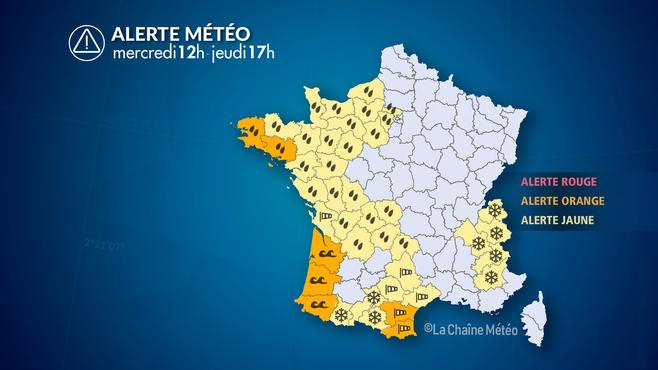 Mercredi après-midi, de nouvelles fortes pluies ou averses circulent entre Bretagne, Pays de la Loire et Normandie avec des intensités de 3 à 5 mm/heure en moyenne. Dans le nord-est, la perturbation s'évacue progressivement avec un redoux et une fonte de la neige.